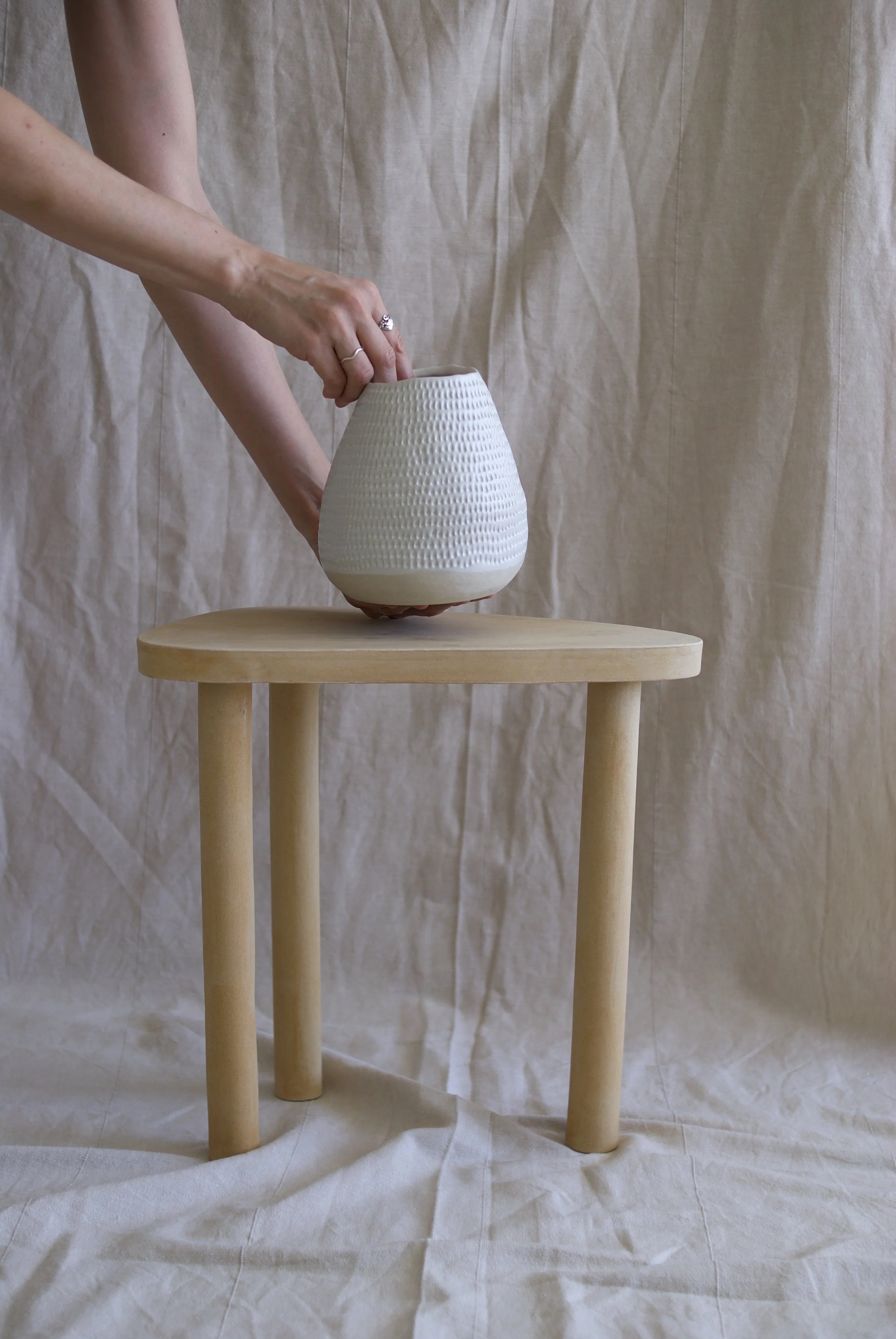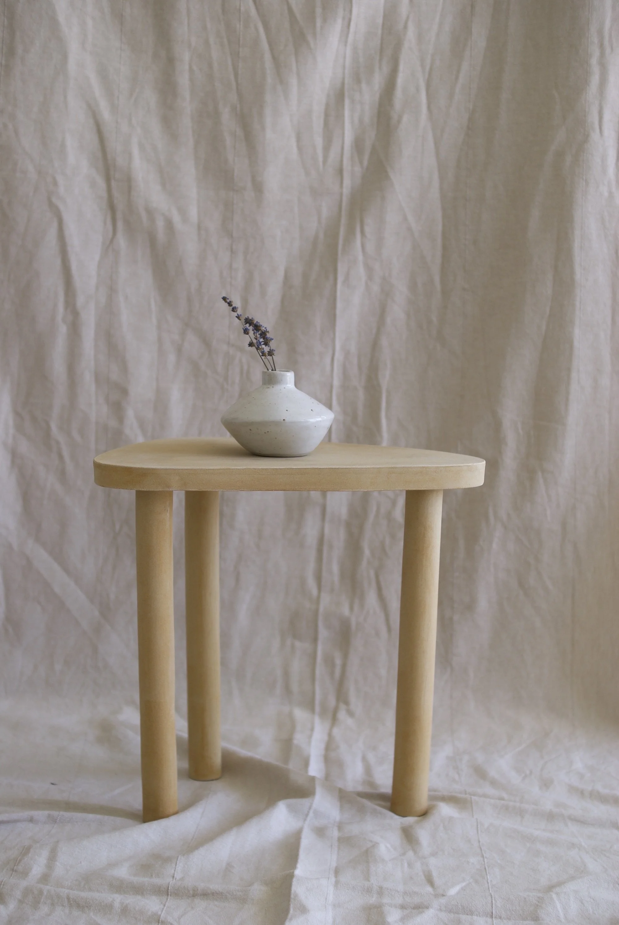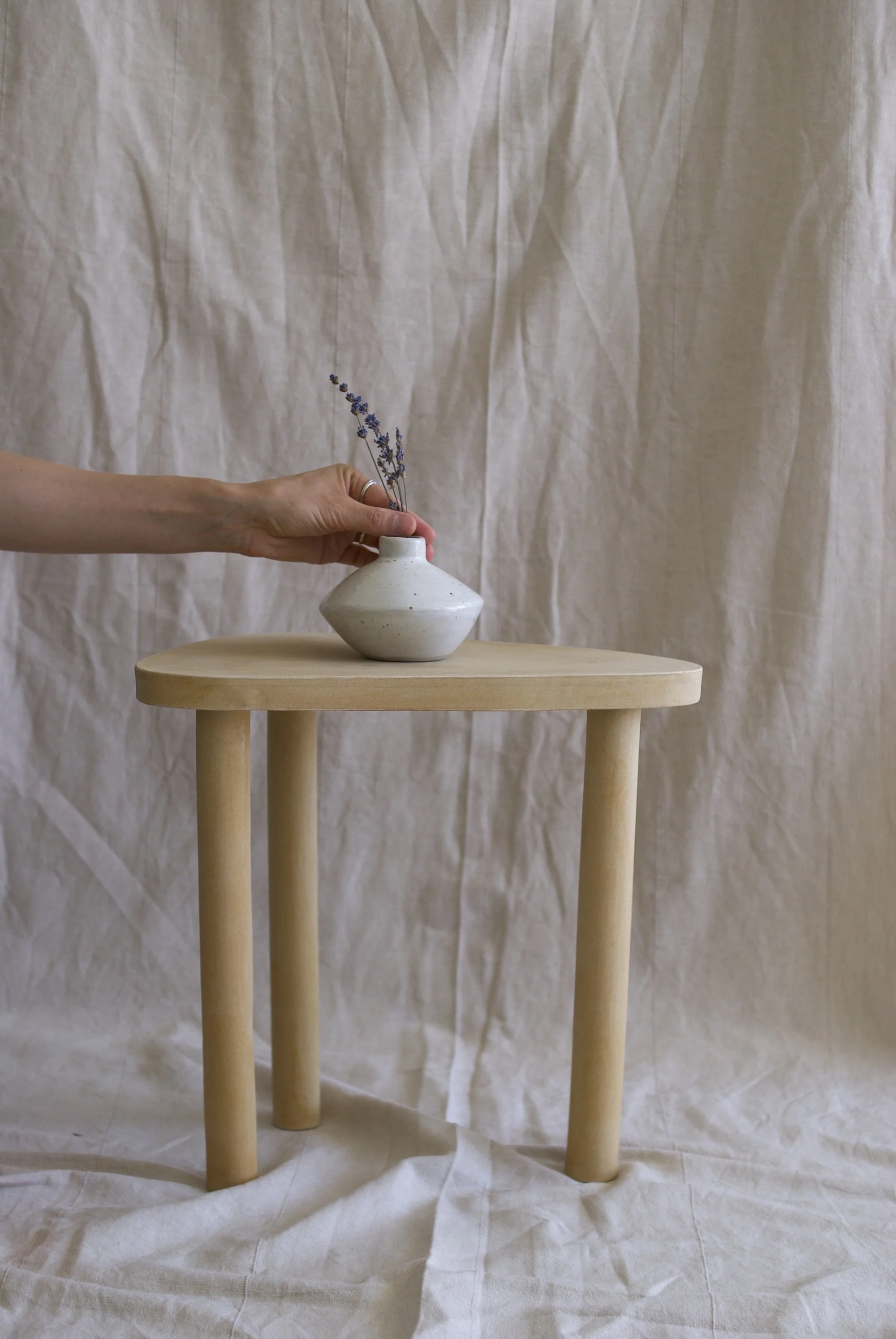 Handgebauter Tisch aus Steingut; Höhe und Breite maximal 36 cm.