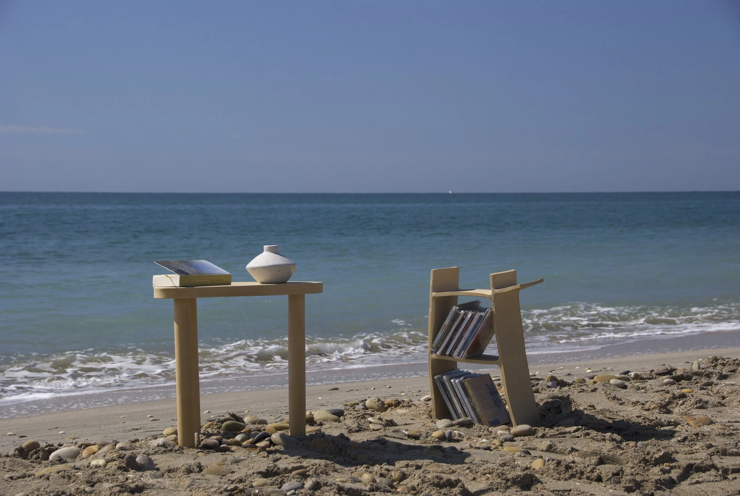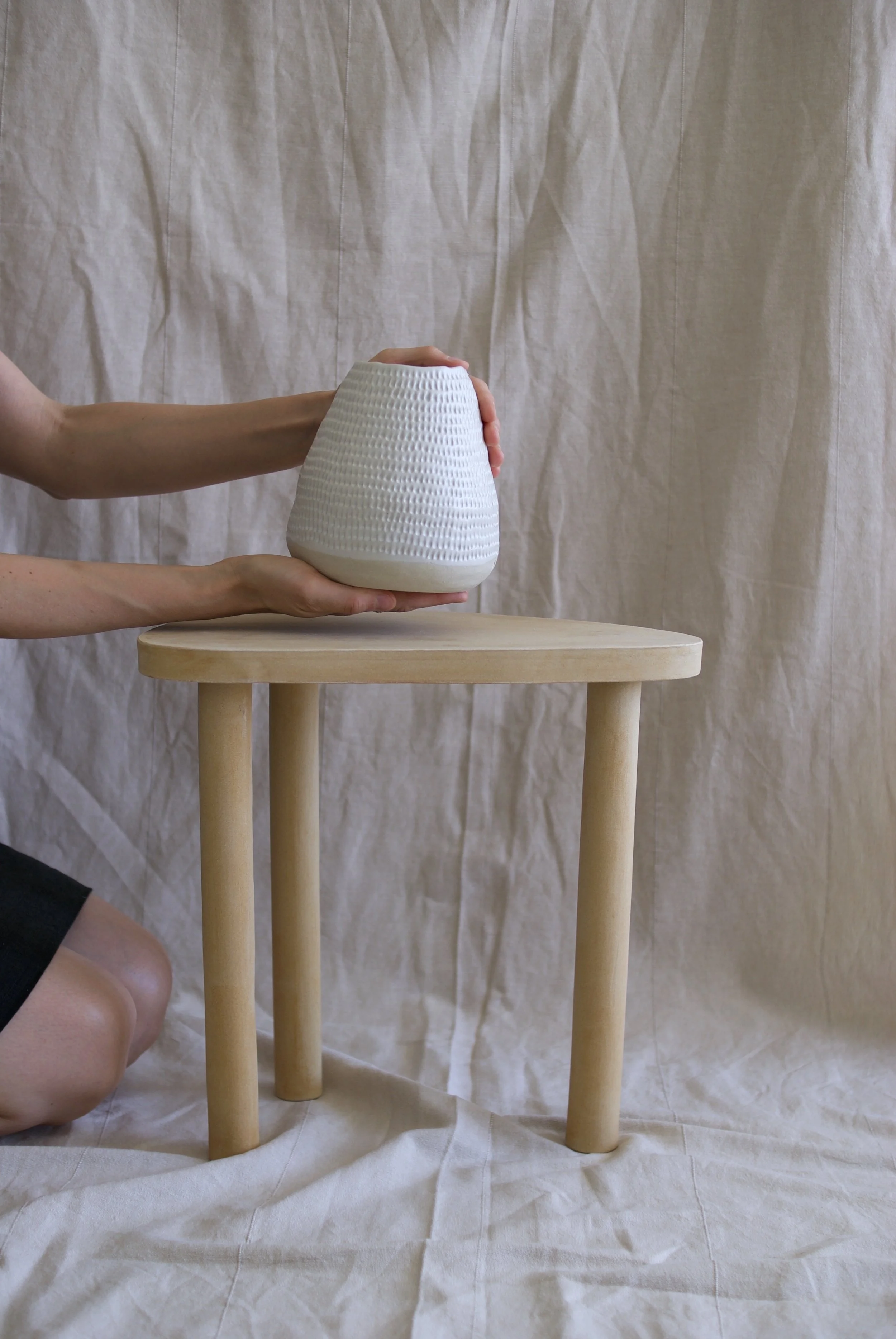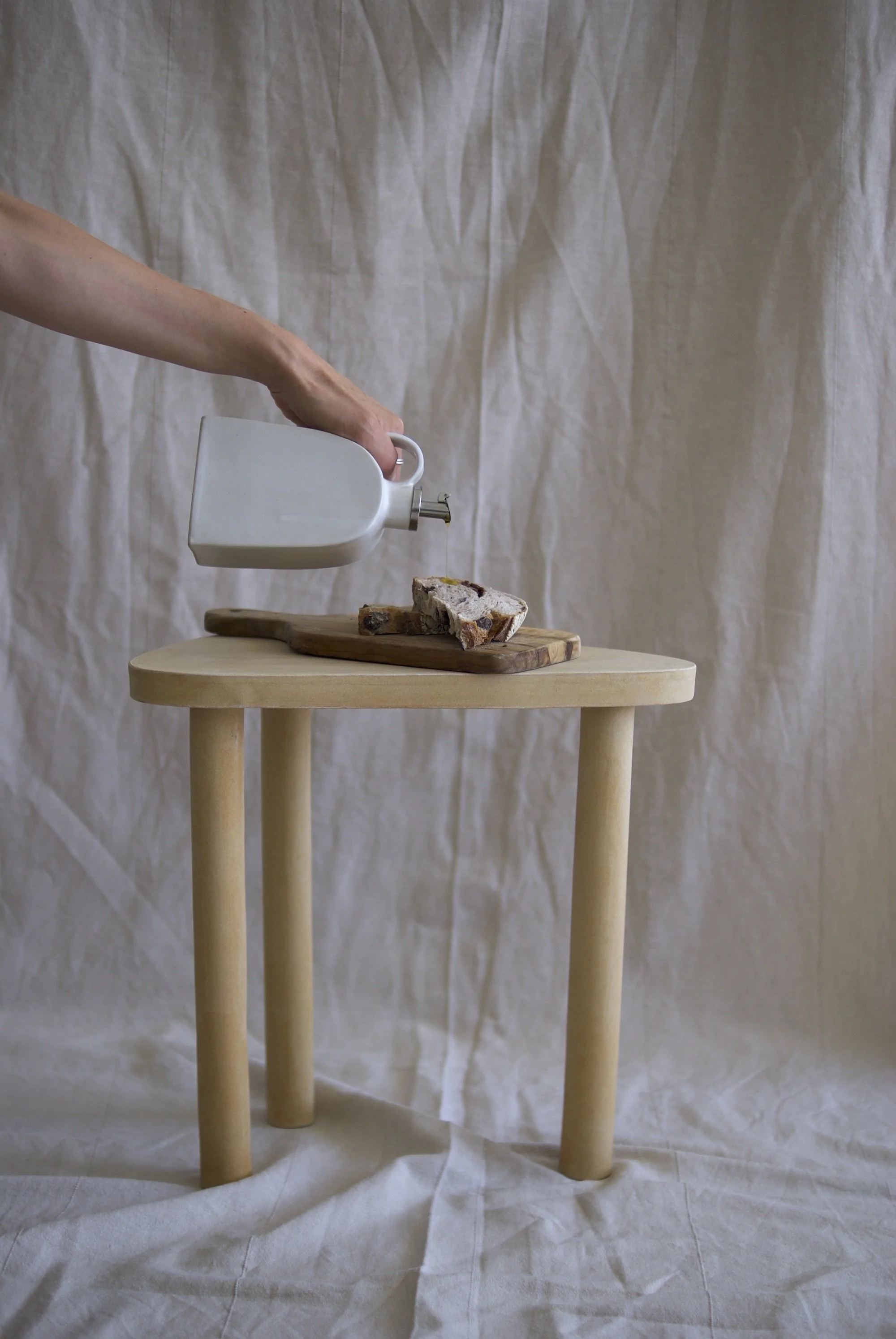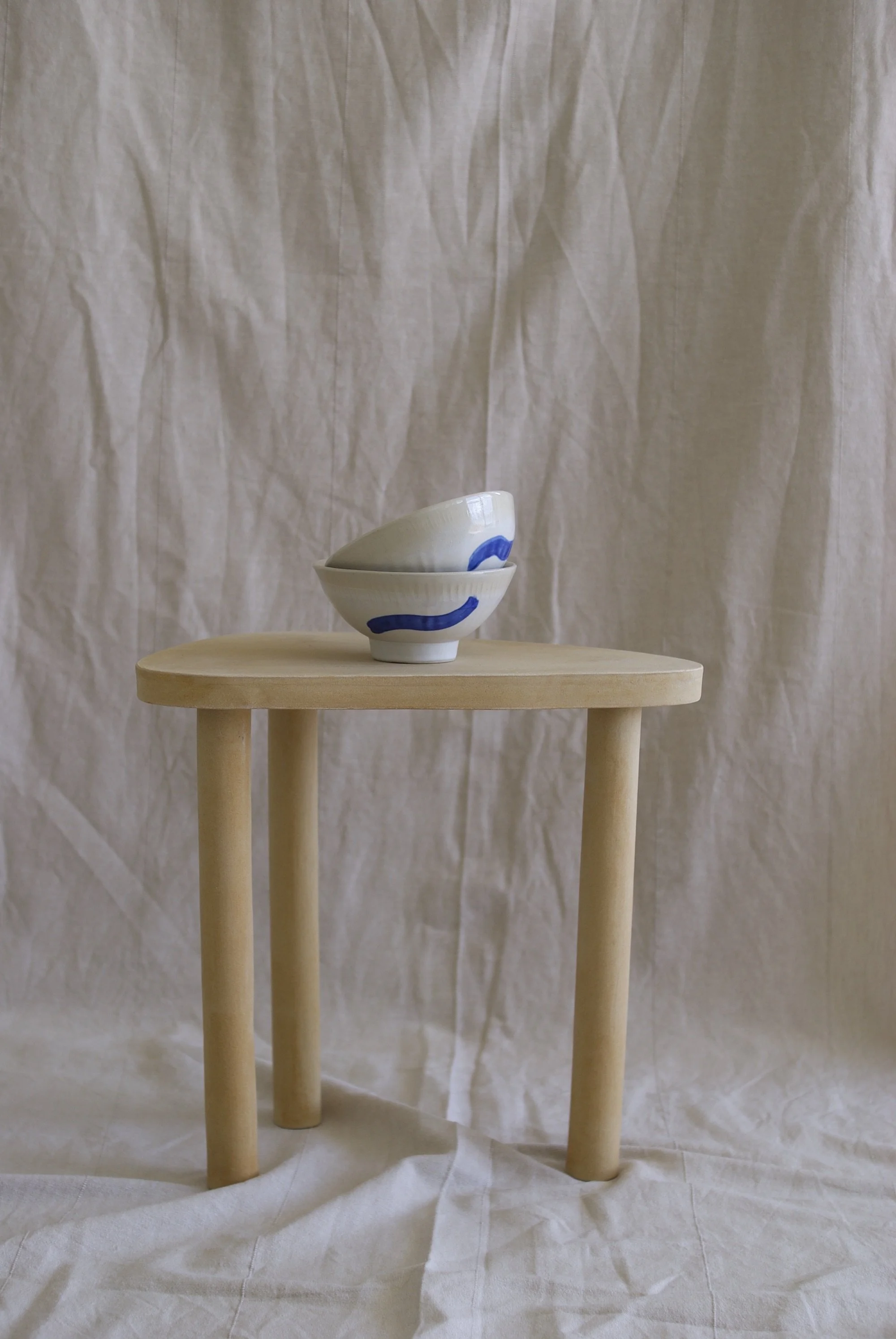 Handgebauter Tisch aus Steingut; Höhe und Breite maximal 36 cm.