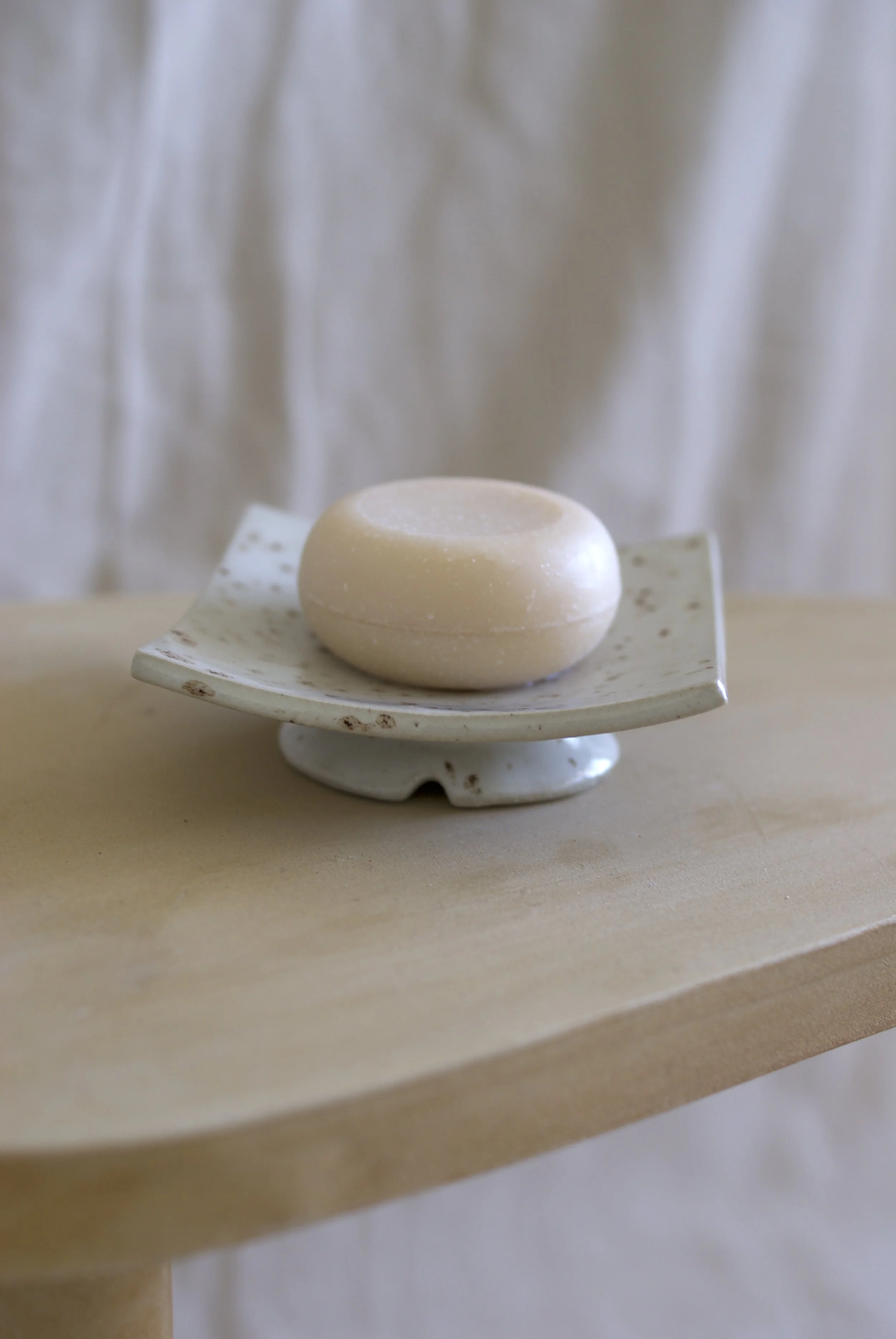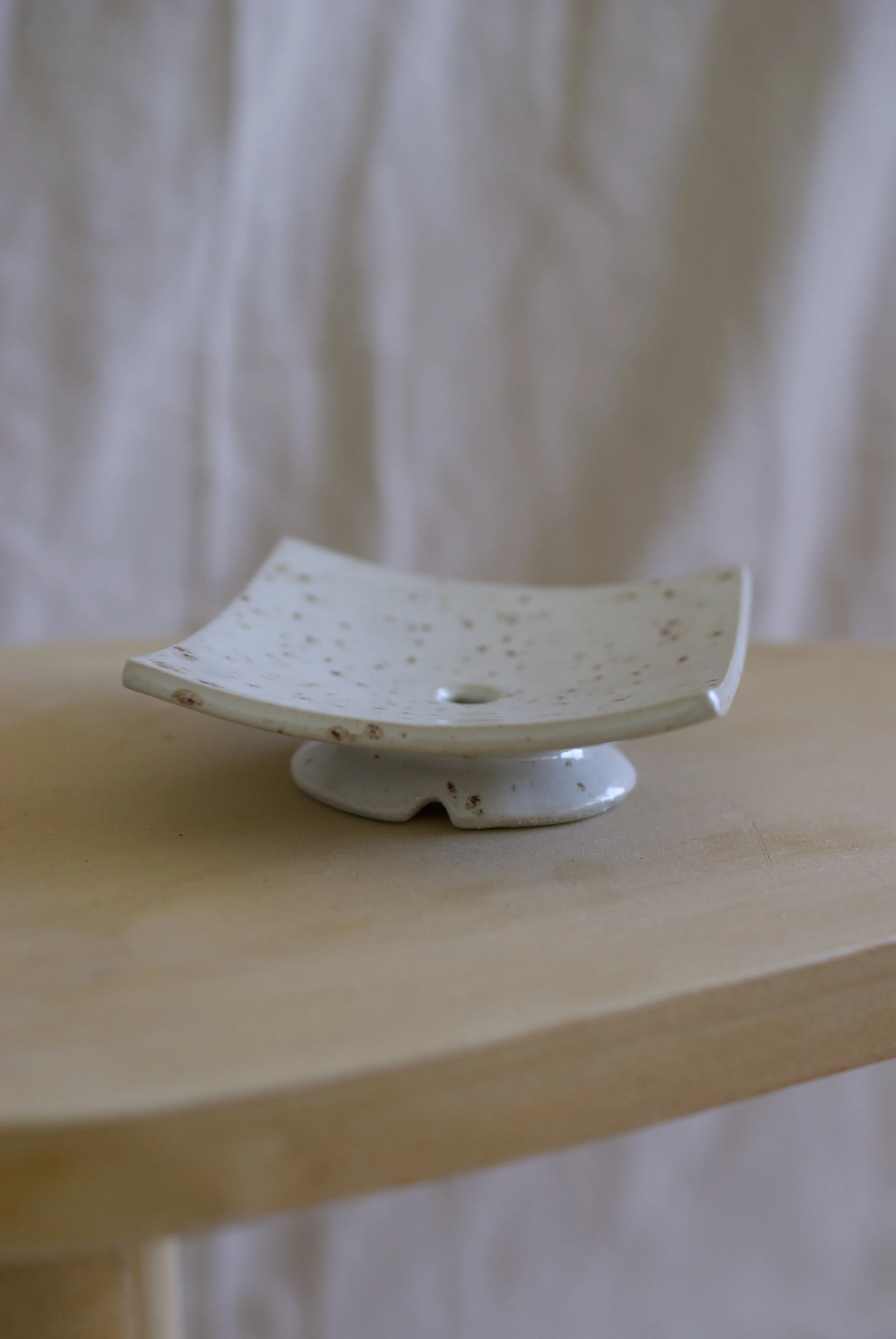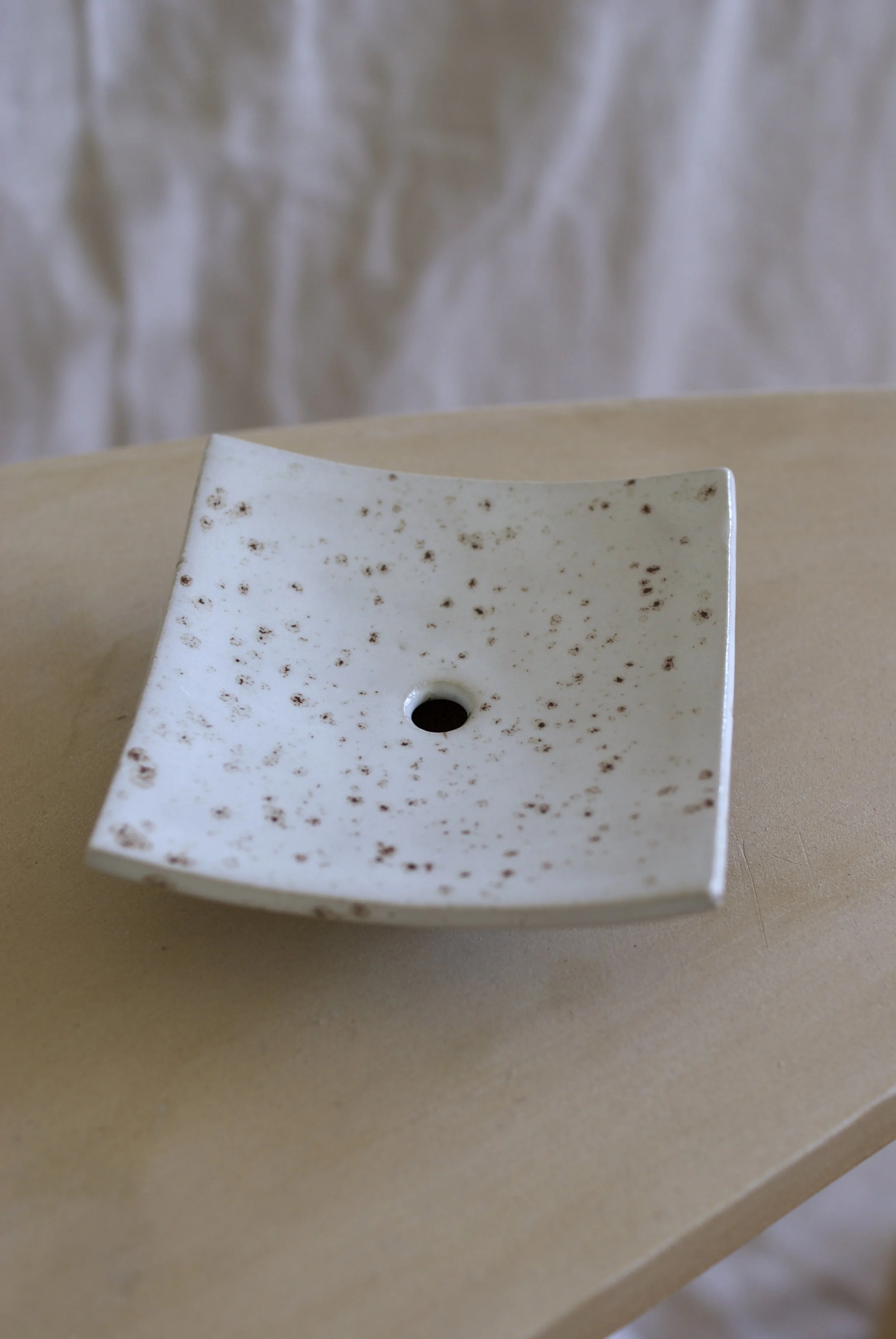 Handgebauter Seifenhalter aus Steingut, mit dekorativer Glasur und Abtropfloch; Fläche 10 * 10 cm.