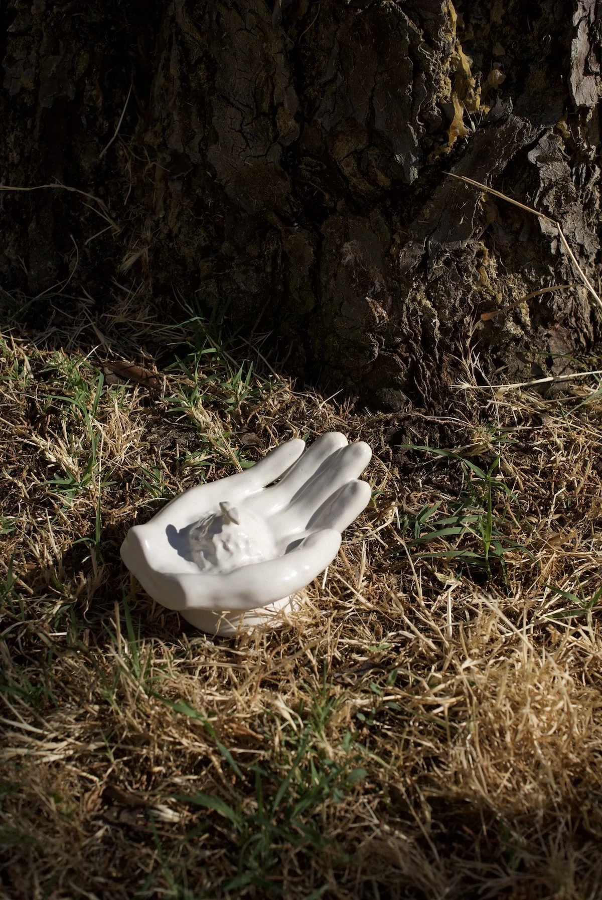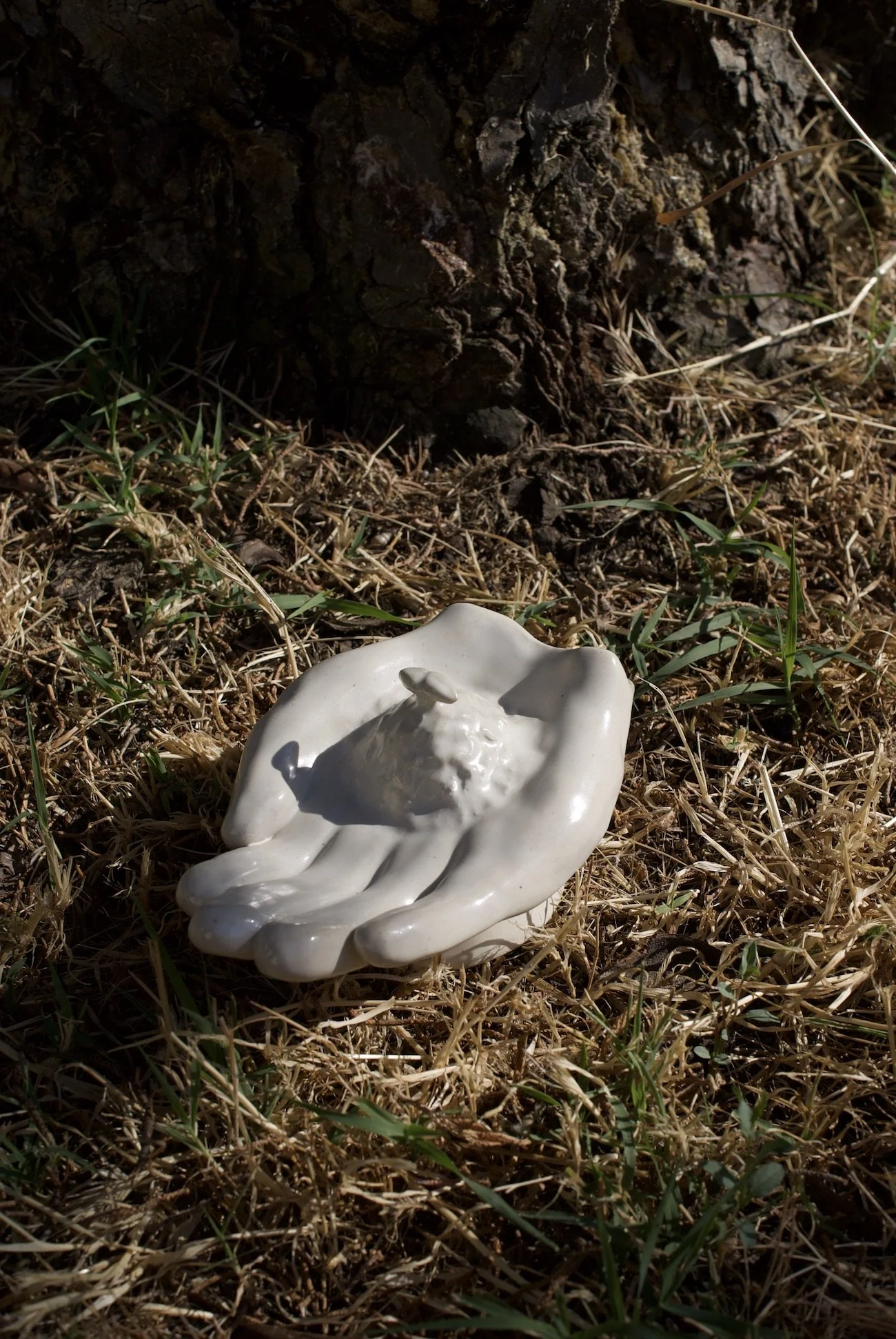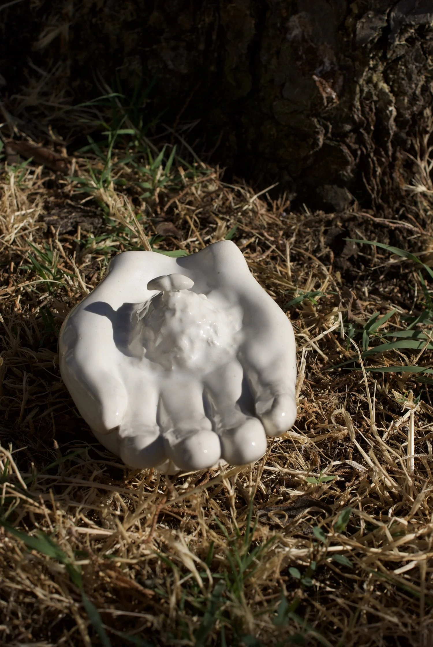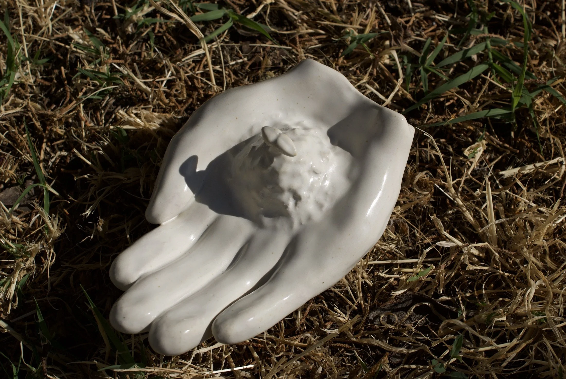 Skulptur aus Steingut: eine Hand hält eine junge Pflanze. Eine Geste, um den Verstorbenen für alles zu danken, was sie im Laufe ihres Lebens gegeben und geschaffen haben; maximale Länge ca. 13 cm und Höhe ca. 6,5 cm.