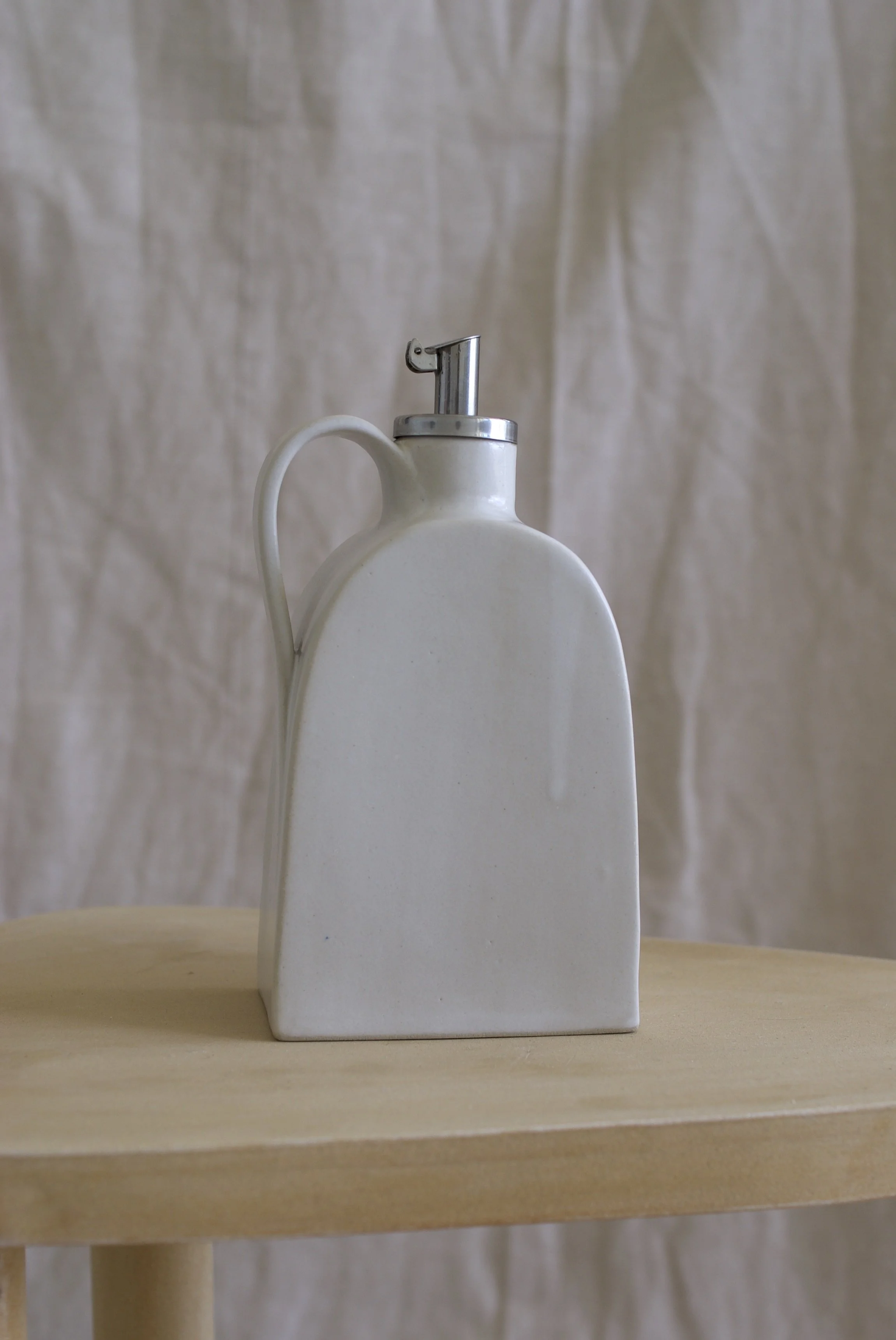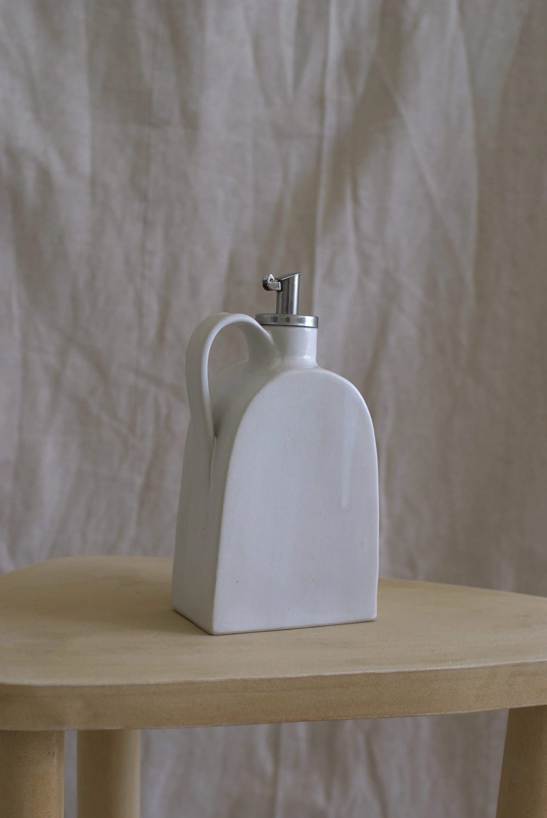 Handgebaute Ölflasche aus Steingut; innen mit lebensmittelechter Glasur, außen mit zinkreicher Glasur; Höhe ca. 15 cm, Innenvolumen ca. 350 ml.