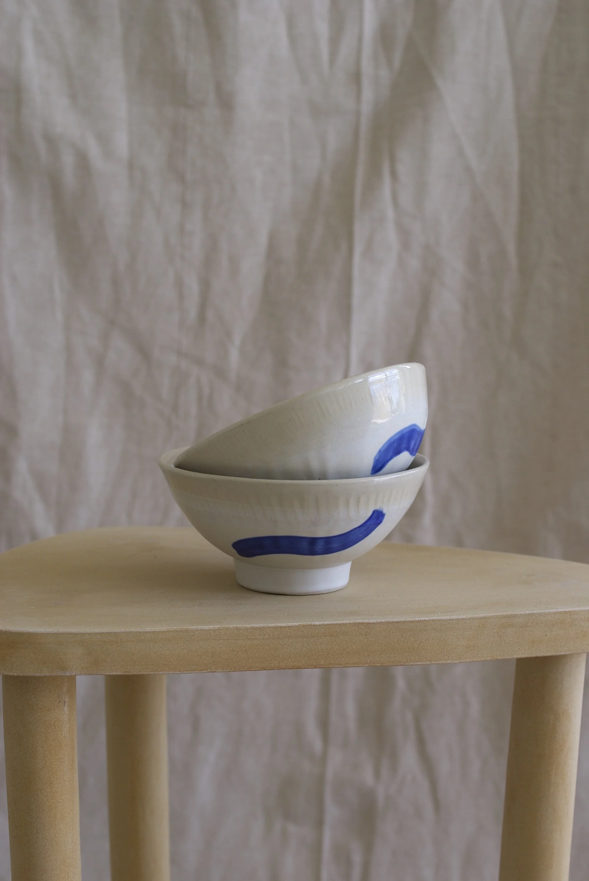 Getöpferte Steingutschalen mit lebensmittelechter Glasur innen und zinkreicher Glasur mit Kobaltoxidverzierung außen; Durchmesser der oberen Kante 13,5 cm; Höhe 6,5 cm.